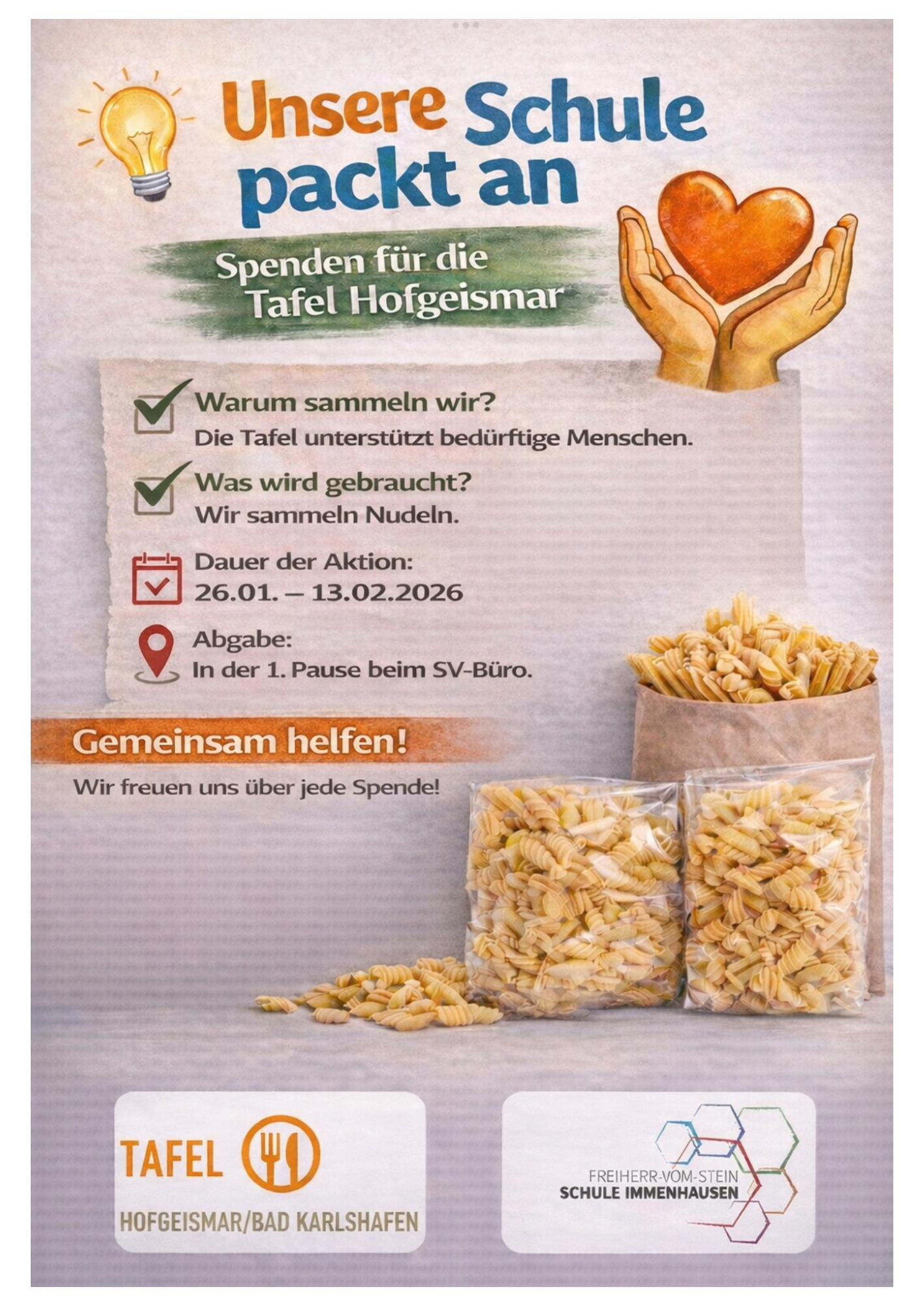 Wir möchten gemeinsam ein Zeichen setzen und Menschen in unserer Region unterstützen. Deshalb startet die Freiherr-vom-Stein-Schule wieder eine große Spendenaktion zugunsten der „Tafel Hofgeismar“. Um die Arbeit der Tafel gezielt zu unterstützen, sammeln wir dieses Mal ausschließlich Nudeln (originalverpackt und haltbar).