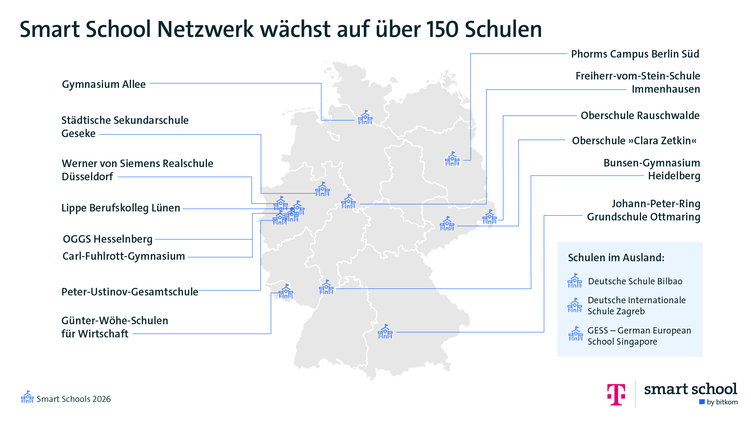 Info: Die ersten Smart Schools wurden 2016 im Rahmen des Nationalen IT-Gipfels der Bundesregierung ausgezeichnet. Seit 2018 wird das Projekt vom Bitkom weitergeführt. Inzwischen umfasst das Smart-School-Netzwerk 152 digitale Vorreiterschulen – 148 Schulen bundesweit, von Grundschulen über Gesamtschulen und Gymnasien bis zu Berufsschulen, sowie mittlerweile vier Deutsche Auslandsschulen. Zweimal im Jahr trifft sich das Netzwerk, um Best Practices auszutauschen und Herausforderungen zu diskutieren. Weitere Informationen zu Smart Schools, Wettbewerb und Bewerbungsverfahren finden sich unter www.bitkom.org/smart-school.
